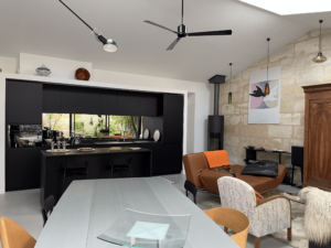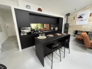 🏠 Découvrez une cuisine noire dans une échoppe bordelaise. Les murs en pierre et le sol en béton ciré gris ajoutent une touche d'authenticité. Un petit îlot accueillant permet à trois personnes de partager un repas.