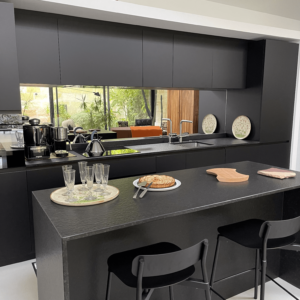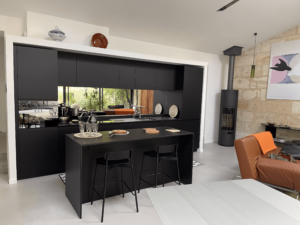 Cette cuisine marie élégance intemporelle et modernité. Le noir apporte une sophistication subtile, tandis que le béton ciré ajoute une touche contemporaine. Chaque détail est pensé pour associer style et fonctionnalité.